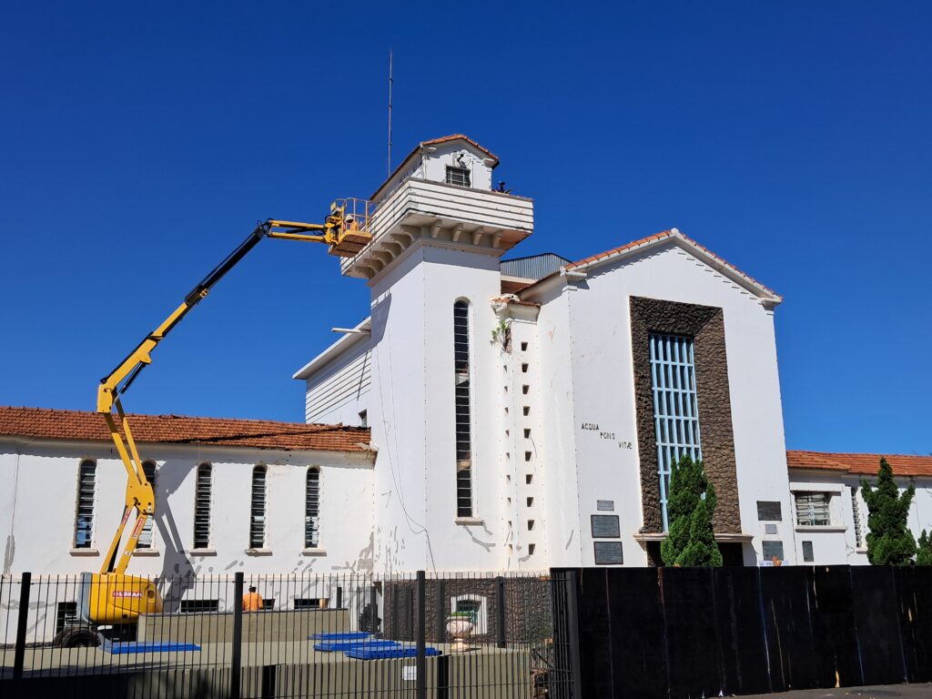 A construção está recebendo tratamento para reparar fissuras nas paredes e também será realizada uma revisão total nos telhados e a pintura de toda a fachada do prédio.