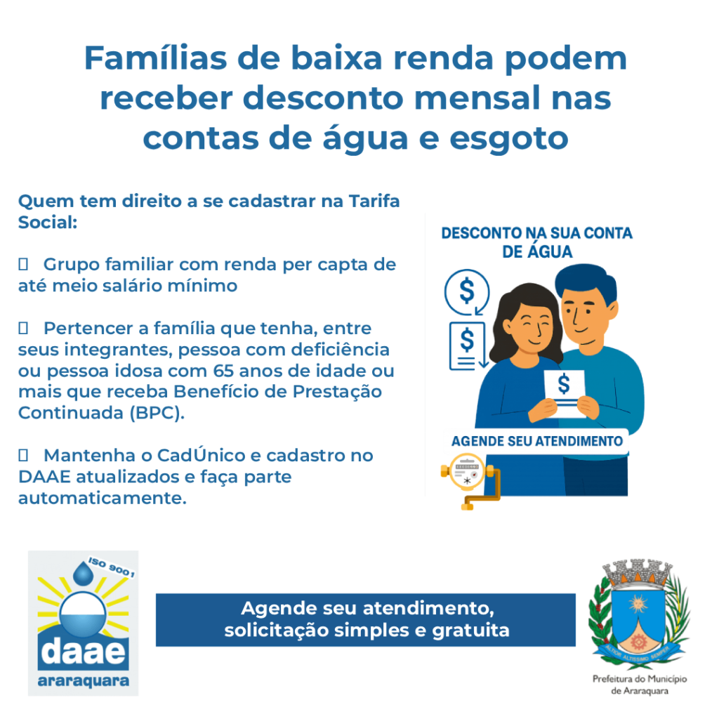 Os benefícios sociais do Daae ajudam milhares de famílias de Araraquara. Entre esses benefícios está a Tarifa Residencial Social, que somente no ano passado teve 3.396 famílias cadastradas, com possibilidade de desconto de até 50% na conta de água.