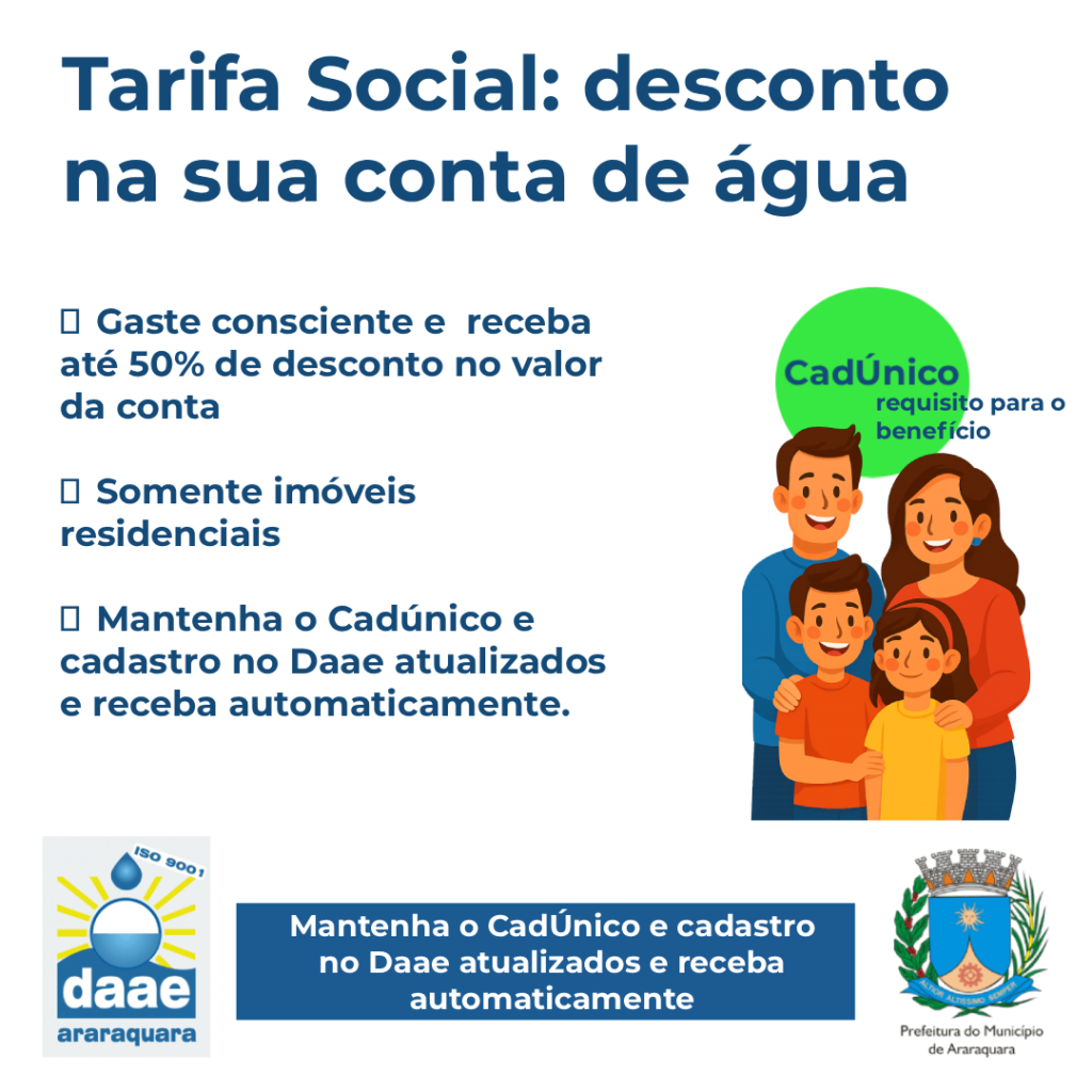 O Daae possui o compromisso de garantir o acesso à água para toda a população de Araraquara e uma das ferramentas mais importantes para que isso ocorra é a Tarifa Social, que concede descontos de até 50% na conta.